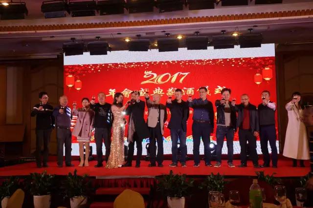 在吴董的带领下,汇合领导们一起上台开始了敬酒仪式,大家共同预备畅饮!2017,汇合一起!撸起袖子加油干!干杯!