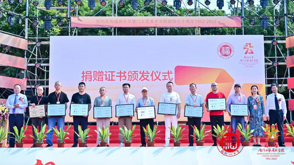 2022年11月11日,福州大学厦门工艺美术学院迎来70周年校庆,95级校友吴腾波捐赠了27万元,助力母校七十周年庆。福州大学厦门工艺美术学院领导为校友举行捐赠仪式并颁发捐赠证书。