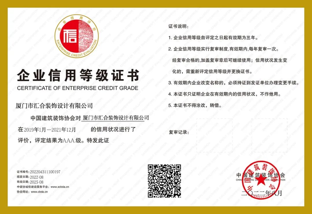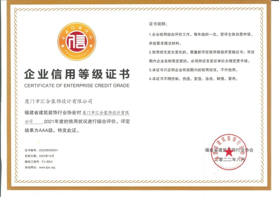 再次获评“福建省建筑装饰协会信用等级评定AAA级”