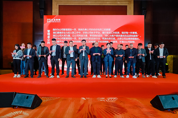 汇合装饰管理层员工共同宣誓:我们肩负着公司的信任和员工的期望带领团队“用心为客户提供最优的品质和服务”,严于律已、以身作则做全体员工的楷模。