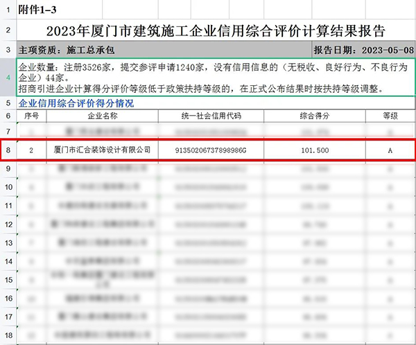 信用优企丨评2023年厦门市建筑施工企业信用分评价等级A级