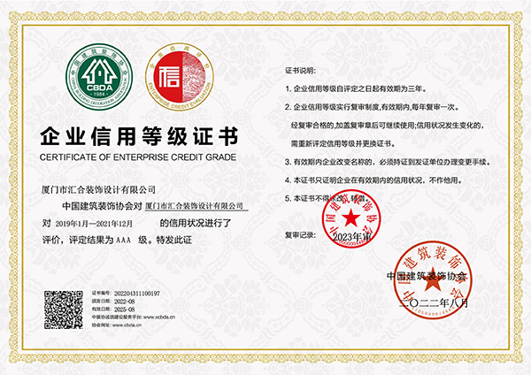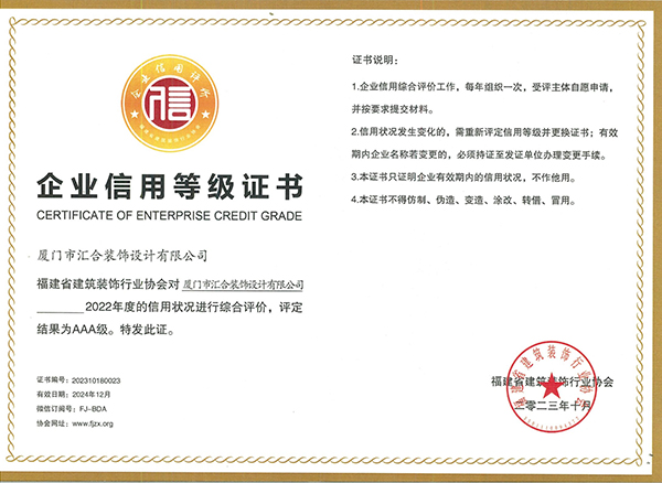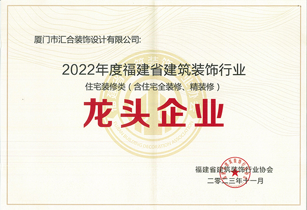 荣获2022年度福建省建筑装饰行业住宅装修类(含住宅全装修、精装修)龙头企业