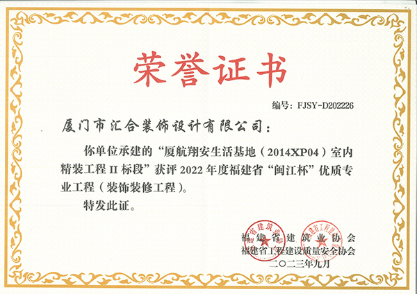 厦航翔安生活基地(2014XP04)室内精装工程II标段荣获2022年度福建省“闽江杯”优质专业工程奖(装饰装修工程)