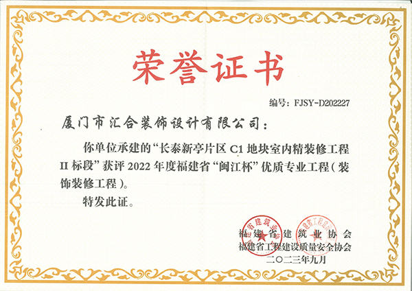 长泰新亭片区C1地块室内精装修工程II标段荣获2022年度福建省“闽江杯”优质专业工程奖(装饰装修工程)