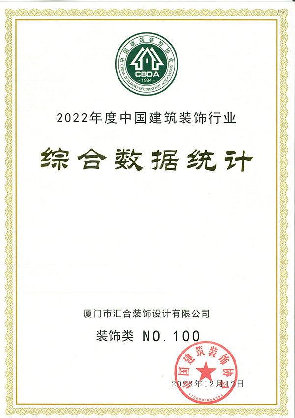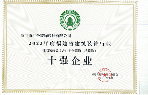 荣获2022年度福建省建筑装饰行业住宅装修类(含住宅全装修、精装修)十强企业