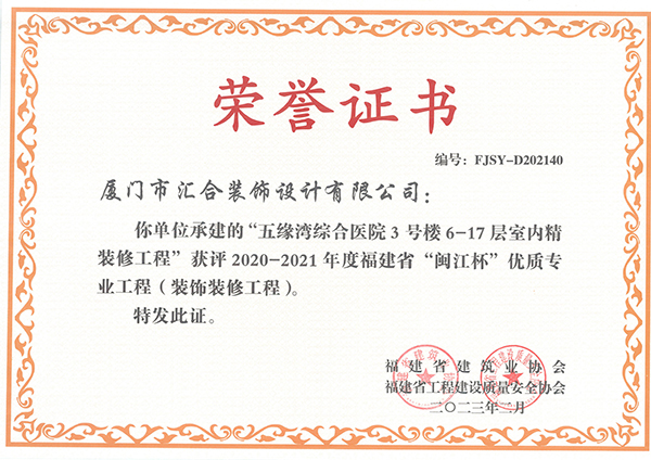 五缘湾综合医院3号楼6-17层室内精装修工程荣获2020-2021年度福建省“闽江杯”优质专业工程奖(装饰装修工程)