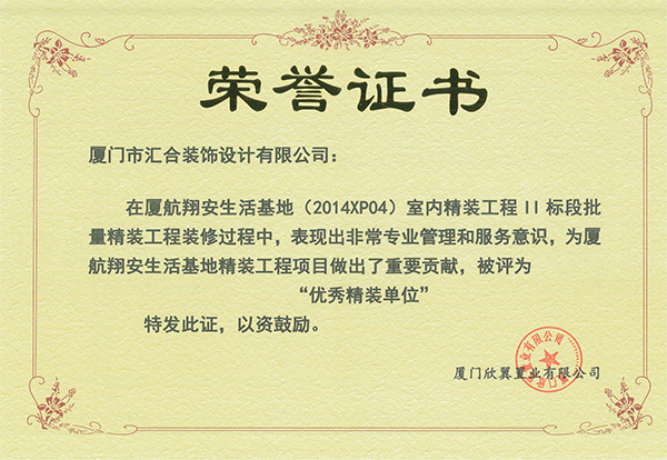厦门欣翼置业有限公司厦航翔安生活基地(2014XP04)室内精装工程II标段指精装工程评为“优秀精装单位”